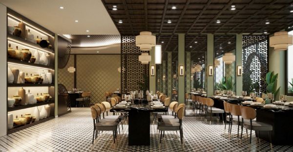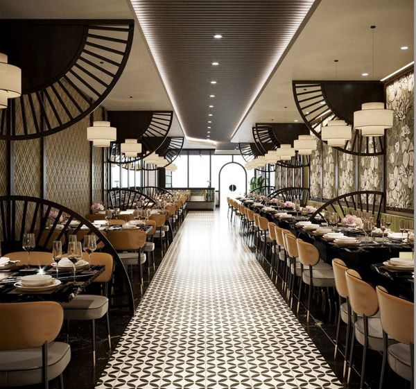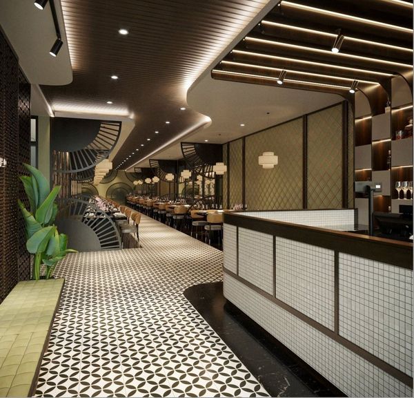 Sự kết hợp, giao thoa giữa 2 phong cách thiết kế. Khách hàng có thể cảm nhận được sự quen thuộc trong việc sử dụng màu sắc mà vẫn cảm nhận được sự hiện đại trong thiết kế nội thất nhà hàng. Khu vực quầy lễ tân được thiết kế độc đáo với điểm nhấn là các ô vuông đan xen lẫn nhau.