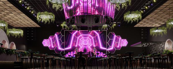 Hành lang lối vào khu vực phòng Vip với giàn đèn led và những chiếc ghế sofa tân cổ điển đầy mê hoặc